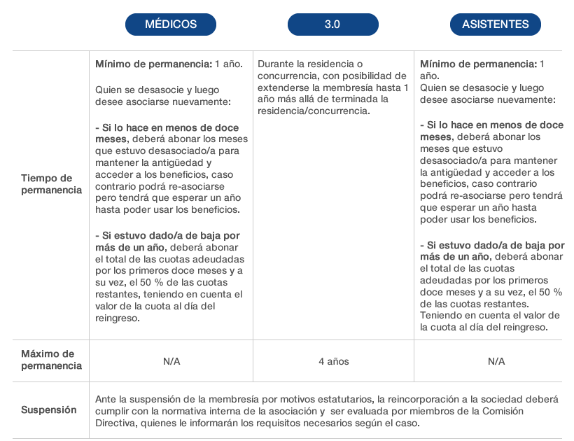 Valor de la cuota: $ 25.252 - SOCIOS ADHERENTES: serán los profesionales médicos que posean título médico habilitante, y hasta tanto no cuenten con dos años de antigüedad en esta categoría y pidan su pase a la categoría de socios titulares, que sean aceptados por la comisión directiva y abonen las cuotas ordinarias y/o extraordinaria correspondiente a su categoría. Tendrán derecho a voz pero no a voto, no podrán elegir ni ser elegidos. Deberán solicitar su ingreso a la comisión directiva a través de una solicitud firmada y con el aval de 2 (dos) socios titulares o vitalicios, a la que adjuntarán fotocopia del diploma de médico, número de matrícula y curriculum vitae.